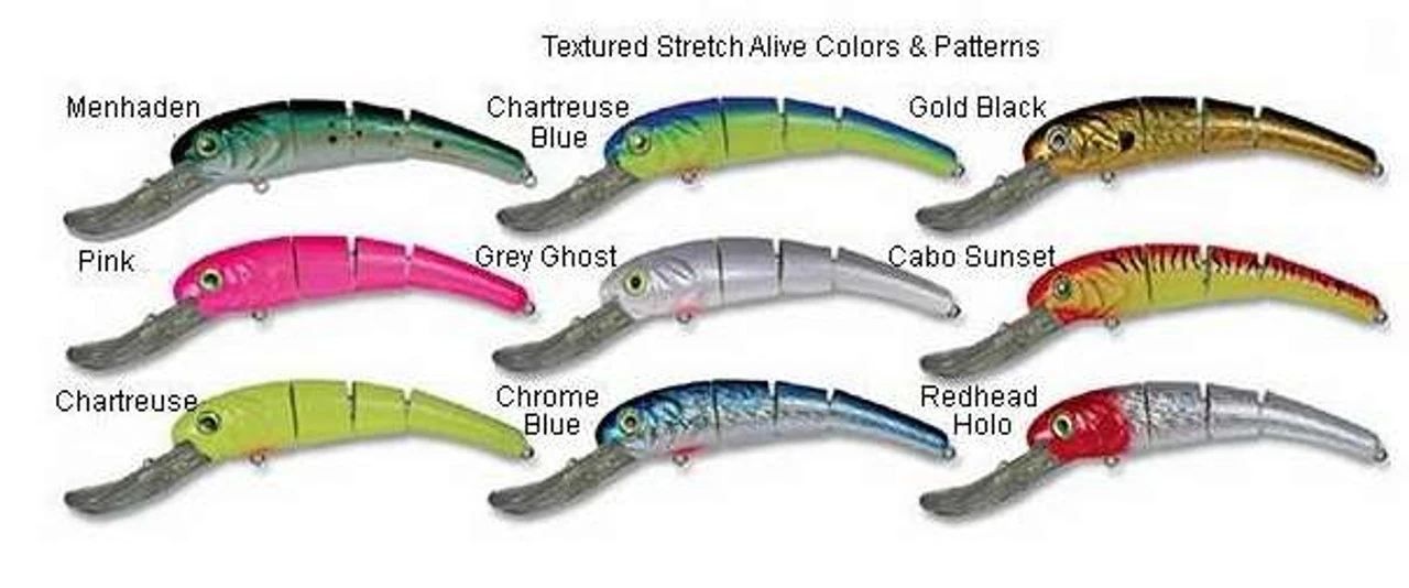 Nothing comes close to the high-performance, deep-diving STRETCH Series trolling baits from Mann’s. And now Mann’s presents the Textured Stretch Alive. A segmented bait in the family of Mann’s famous Stretch 25+ and Stretch 30+ complete with a patented lip design for diving control. Built tough and rugged with heavy duty plastic construction. The Textured Stretch Alive always runs true. And it dives to a depth of 22 to 25′ and it ONLY comes from Mann’s!