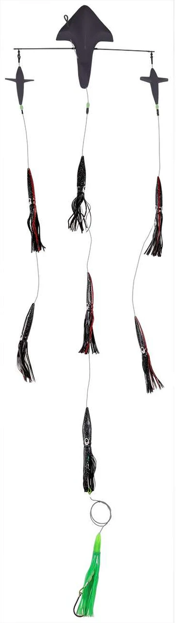 Increasing the width of your spread to ensure you’re covering the maximum amount of water, the PlayAction 18in Outsider Tracker Bars are a must have for those looking to maximize bites while trolling. These directional spreader bars are built on a 1/8in diameter stainless steel bar with an oversized 12in directional bird at the center. The bird rigs the center line in such a way that causes the bar to track outward in either the port or starboard direction. This feature allows the bar to run in a more visible location in the clean water outside the prop wash. The use of both a port and starboard side wide tracker bar can greatly increase the overall width of your spread and make room for you to run additional lines. The center and wing lines are rigged with two 5in Humming Birds and seven 9in blub squids to attract fish to the spread by simulating schooling bait skittering across the surface. The 9in Machine Stinger rigged with an 8/0 heavy duty southern tuna hook seals the deal once the fish are in range. All connection points are professionally crimped with chafe gear for maximum reliability. Each spreader bar comes with its own clear vinyl/mesh lure bag for easy storage and wash down.