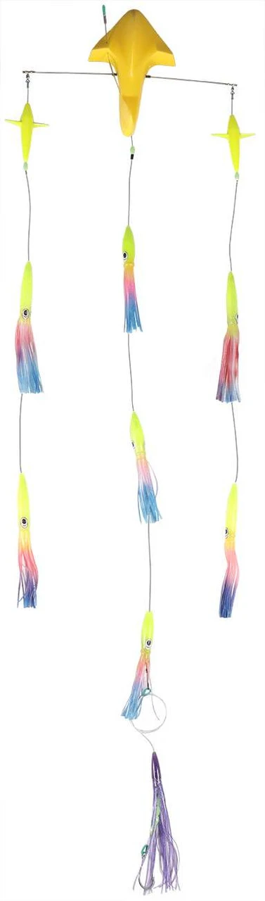 Increasing the width of your spread to ensure you’re covering the maximum amount of water, the PlayAction 18in Outsider Tracker Bars are a must have for those looking to maximize bites while trolling. These directional spreader bars are built on a 1/8in diameter stainless steel bar with an oversized 12in directional bird at the center. The bird rigs the center line in such a way that causes the bar to track outward in either the port or starboard direction. This feature allows the bar to run in a more visible location in the clean water outside the prop wash. The use of both a port and starboard side wide tracker bar can greatly increase the overall width of your spread and make room for you to run additional lines. The center and wing lines are rigged with two 5in Humming Birds and seven 9in blub squids to attract fish to the spread by simulating schooling bait skittering across the surface. The 9in Machine Stinger rigged with an 8/0 heavy duty southern tuna hook seals the deal once the fish are in range. All connection points are professionally crimped with chafe gear for maximum reliability. Each spreader bar comes with its own clear vinyl/mesh lure bag for easy storage and wash down.