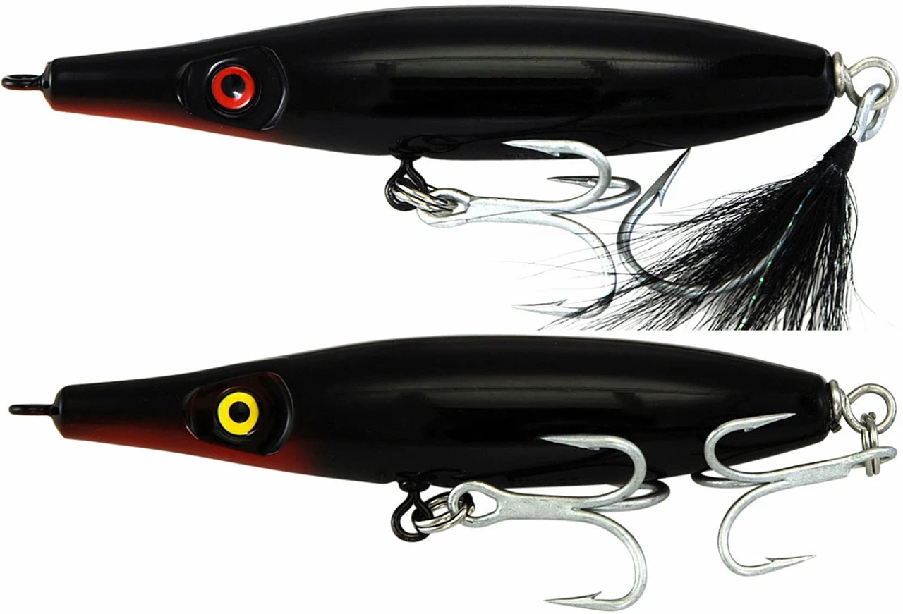 This stubby needlefish lure is great at getting out far. Use when finger mullet and small menhaden are present. Effective on many species from Bluefish of the Northeast to Peacock Bass in South America. Some folks like to fish these with a single feathered hook on the rear instead of the treble.